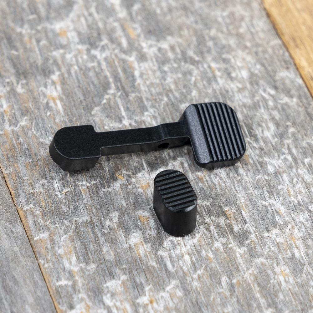 Drop in extended magazine release for all CZ Scorpion 3+ models. In truth you can use almost any AR pattern magazine release button on the right side of the 3+, but the left side is proprietary to the CZ Scorpion 3+ lower receiver. Our left side release features a enlarged thumb paddle with over 30% more area than the factory paddle. The right side is slightly extended over factory (+3mm) and features a blind hole to fully enclose the cross screw and provide a cleaner overall aesthetic than a generic AR mag release button. Both parts are machined from billet 6061T6 aluminum and anodized hardcoat black per MIL-A-8625.